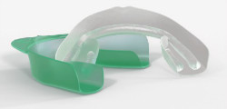 2. マウスピースは緑色のトレイと白いトレイの二重になっています。外側の緑色のトレイを持ち、写真のようにトレイを2つとも装着します。